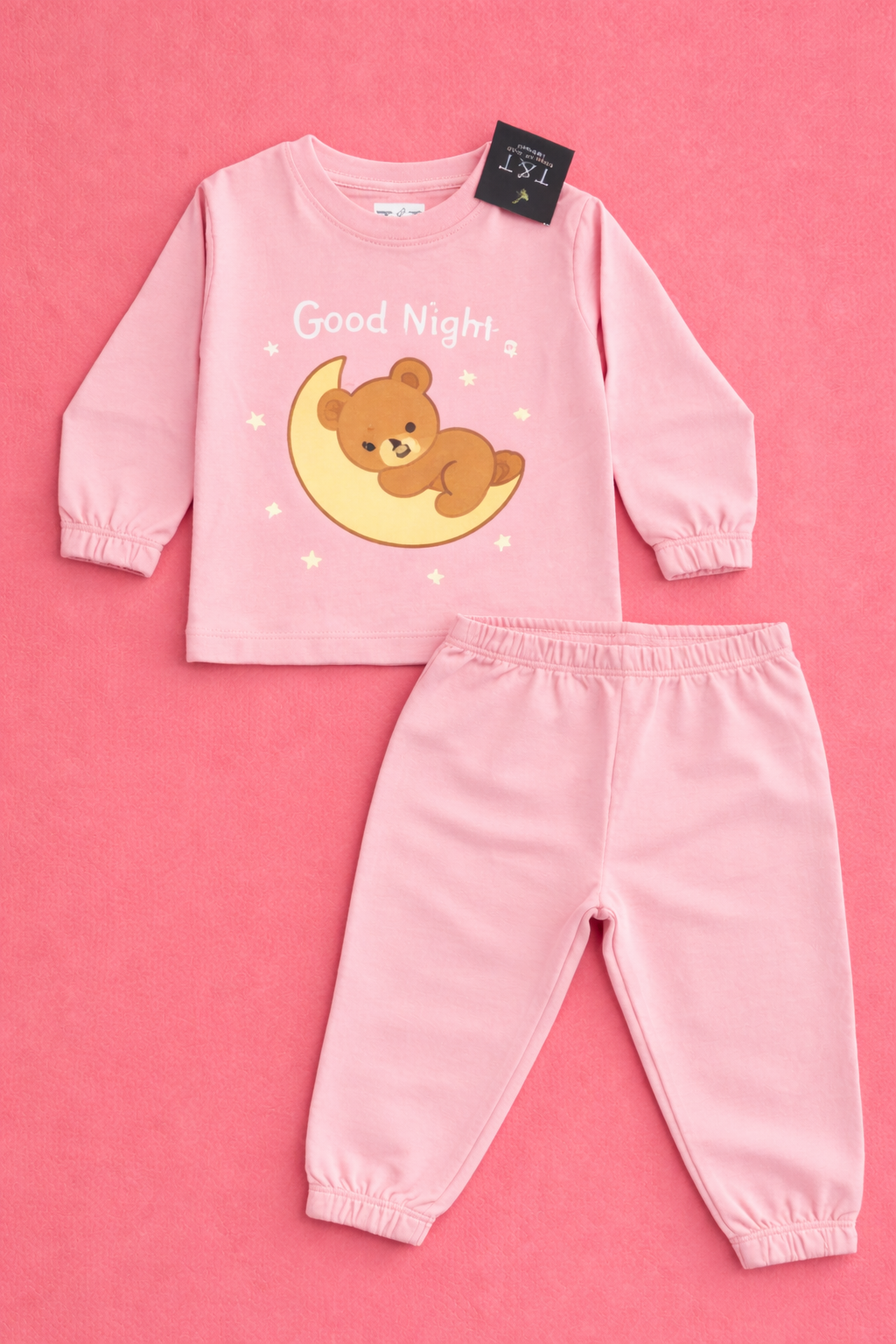 Make bedtime extra cozy with this adorable pink nightwear set designed for comfort and sweet dreams. Featuring a cute “Good Night” teddy sleeping on a moon print, this set adds a calm and playful touch to your child’s bedtime routine.